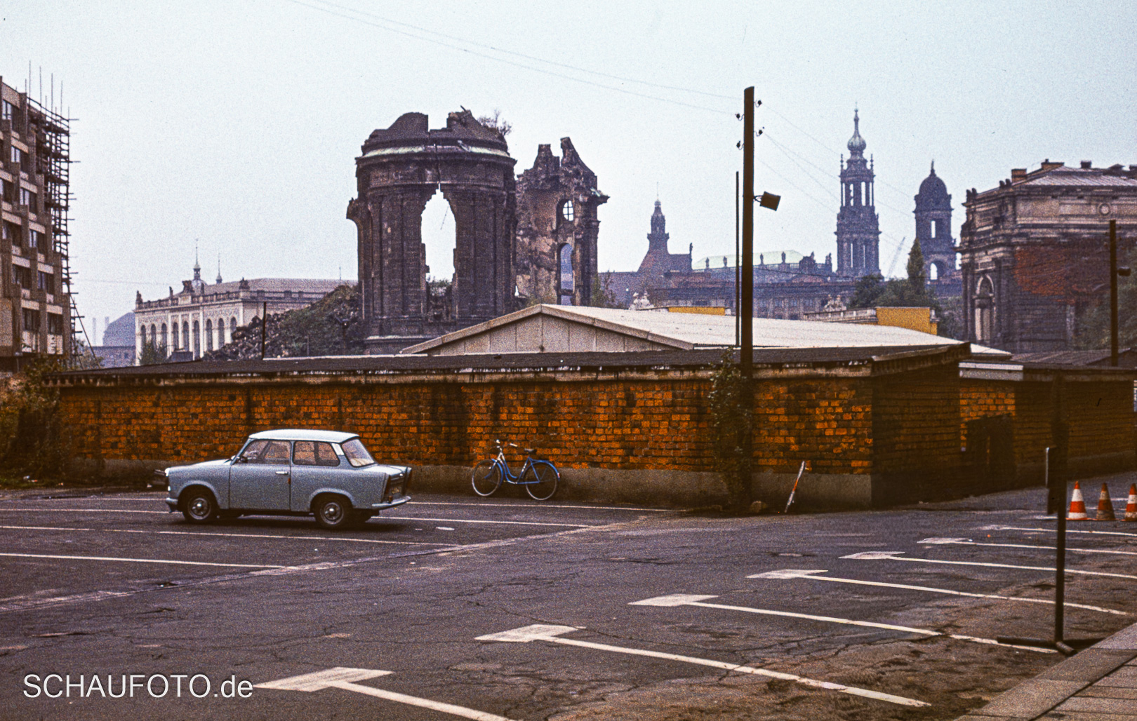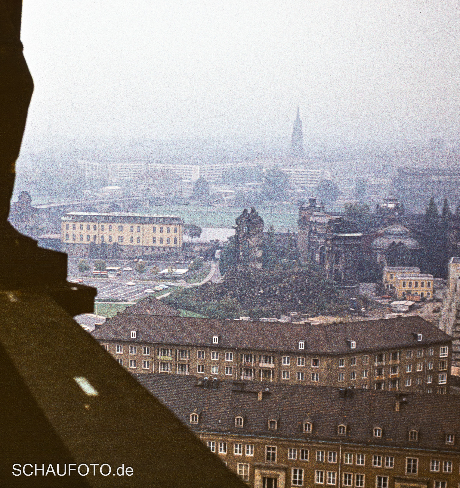 Ich bin gerade beim Digitalisieren meiner Uralt-Dia-Bestände. Dabei sind mir zwei besonders drastische Aufnahmen des Zustandes der Frauenkirche und deren Umgebung im Herbst 1981 aufgefallen. Die muss ich hier einfach zeigen:
