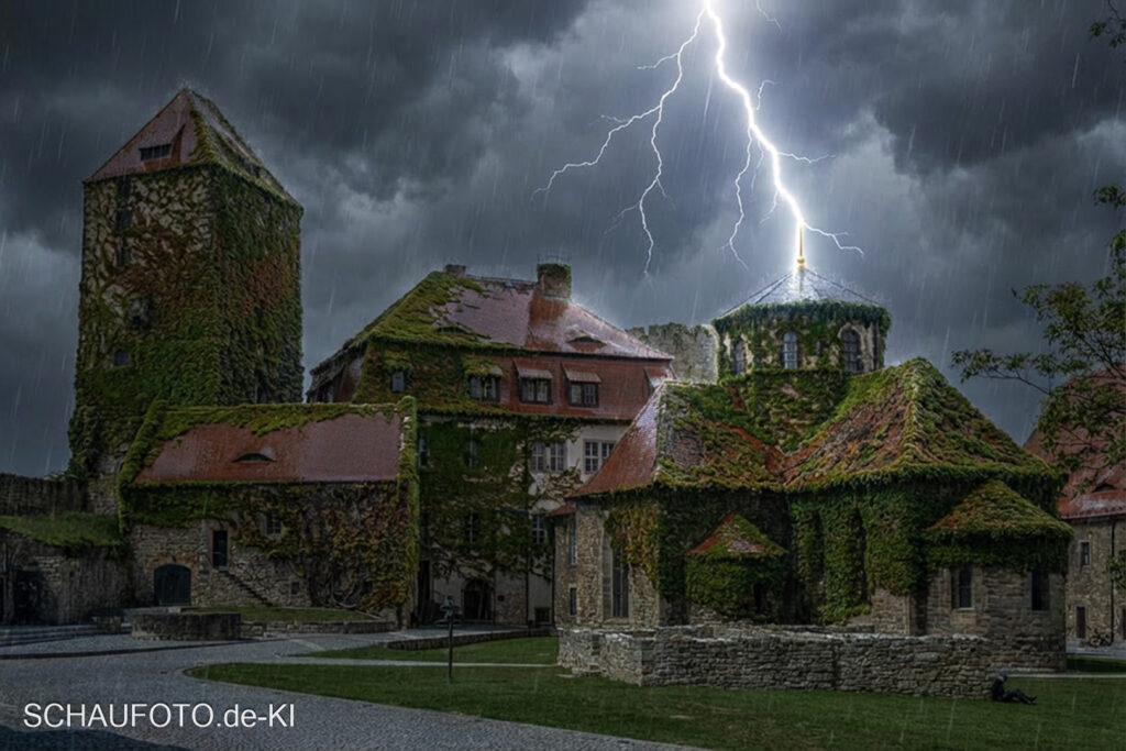 Alle Gebäude sollen von Efeu bewachsen sein. Am Himmel sind Gewitterwolken zu sehen und ein Blitz schlägt gerade in die goldene Spitze des Kirchturmes ein.