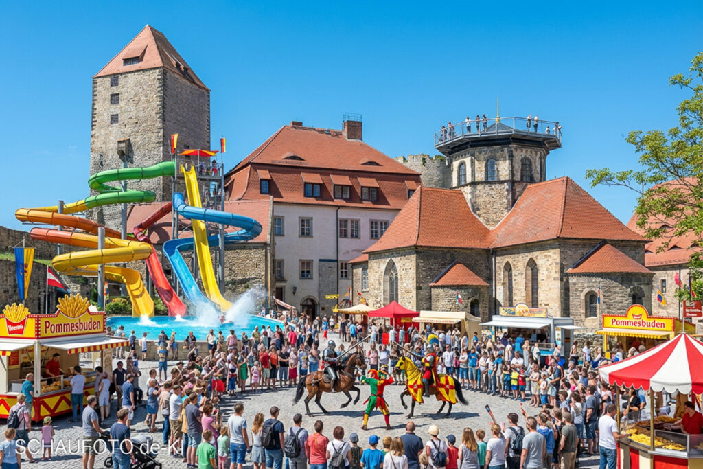Mache aus der Burg einen Freizeitpark. Mit Riesenrutschen vom Bergfried herunter. Mit Pommesbuden. Mit einer Aussichtsplattform auf der Kirchturmspitze. Mit Gauklern und Rittern, die sich einen Schaukampf liefern. Es sollen viele Besucher zu sehen sein.